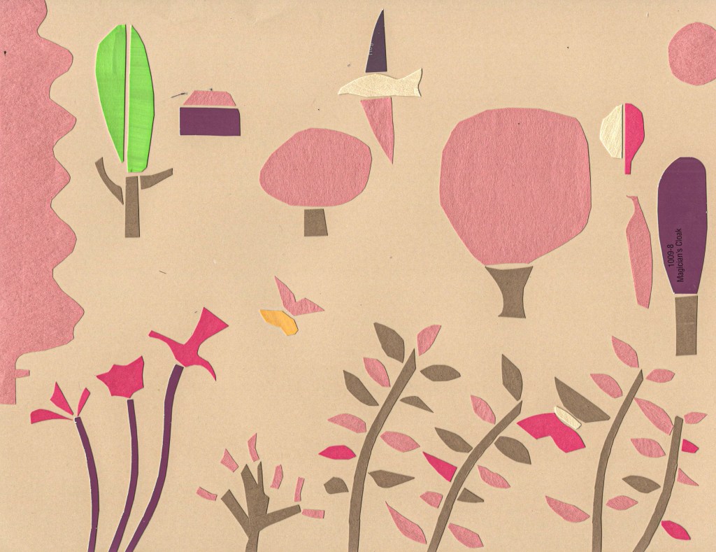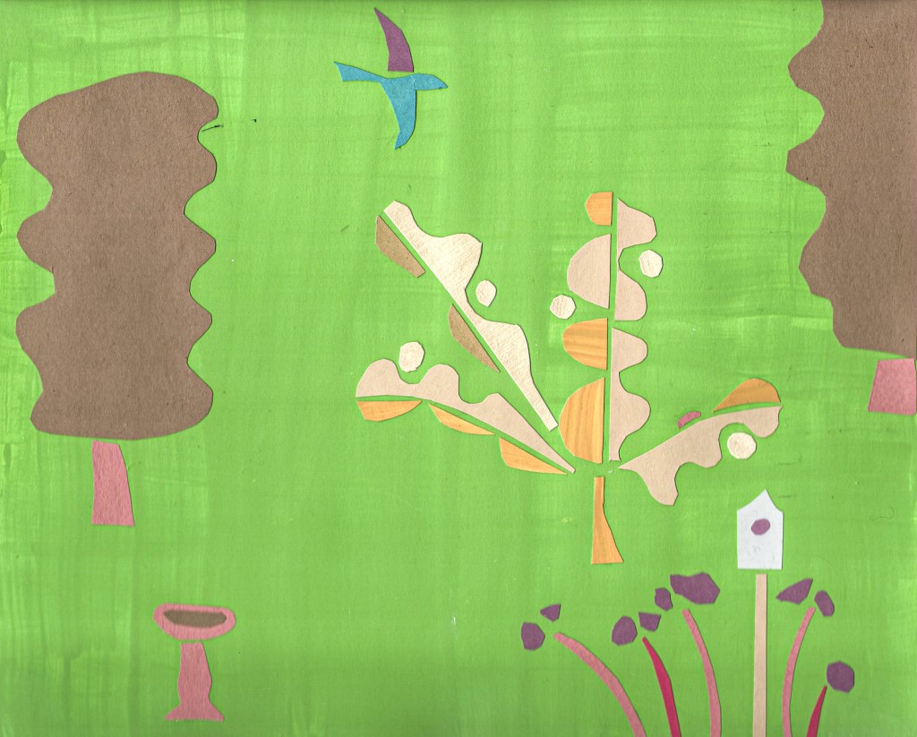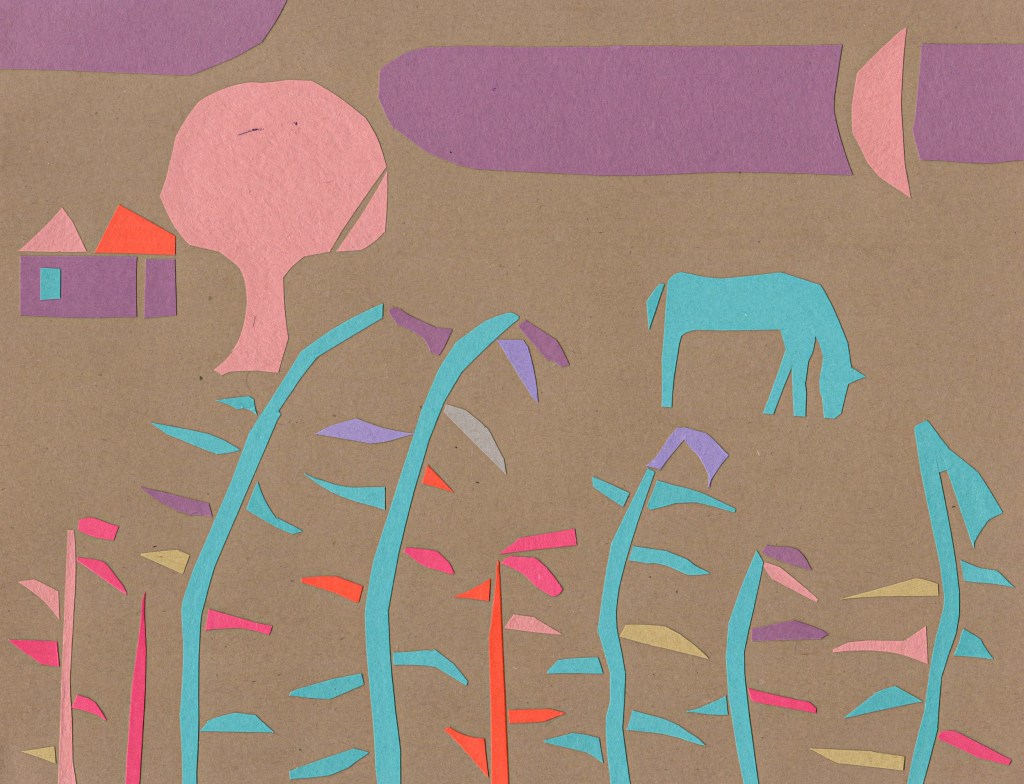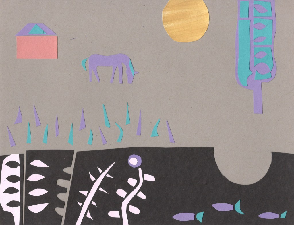 The cut paper collages are forms of visual meditations. The subjects are often landscapes with trees, houses, animals, plants and figures. Usually, I begin with no exact idea. Working with scissors and paper seems to free the mind and can bring some unexpected results. Some pieces are simple and decorative while others may contain narrative elements- parts of a story. Questions may be raised,” who are these people? Why are there four moons? Is the horse or bird a symbol for something else ?” I will often make copies of these collages, then work on top of them with paint or other materials.