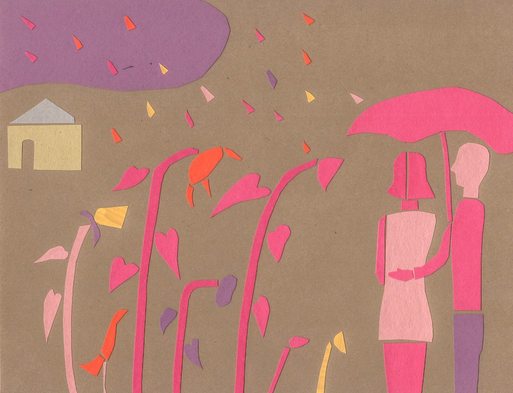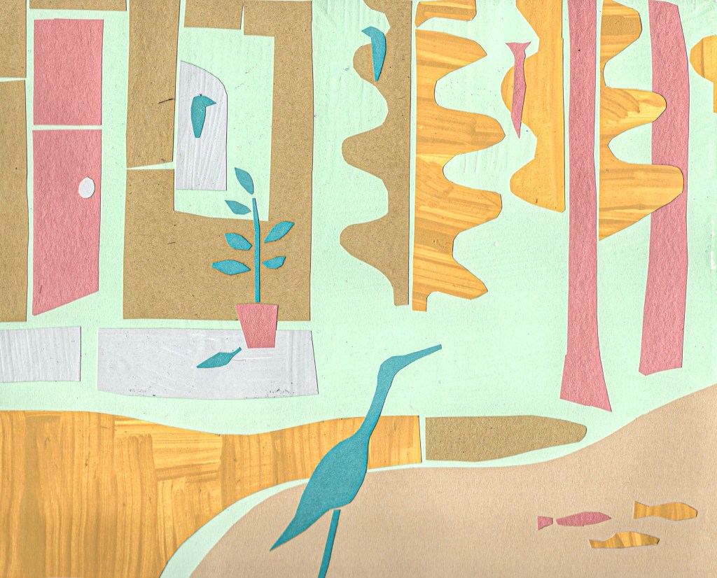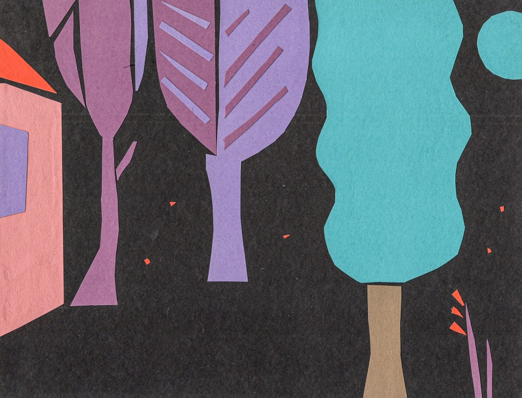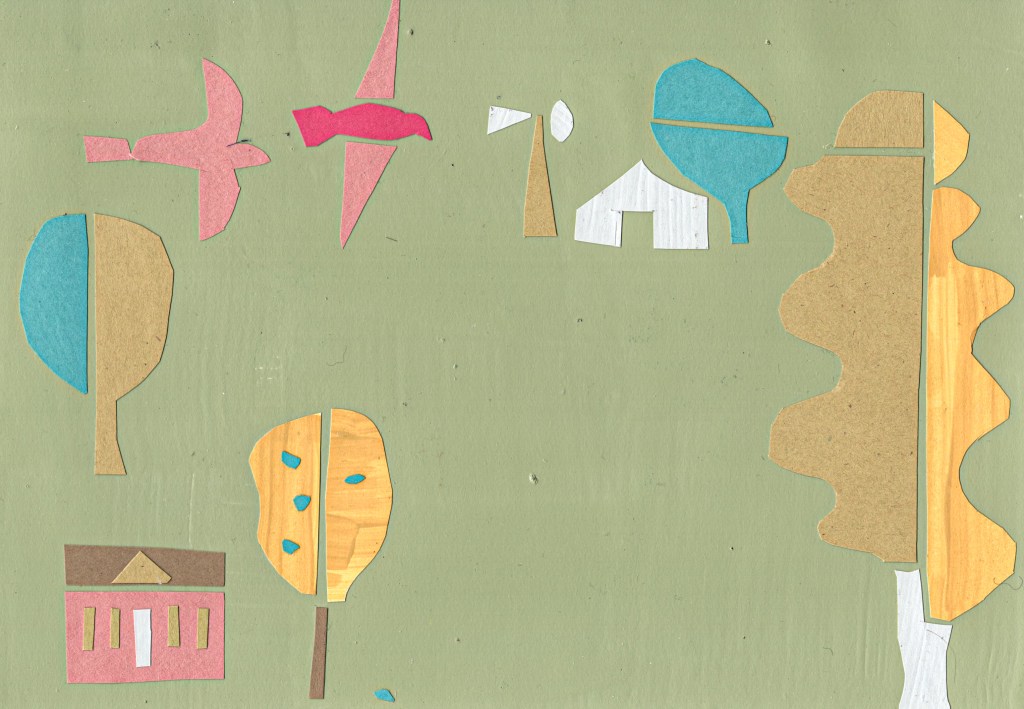 The cut paper collages are forms of visual meditations. The subjects are often landscapes with trees, houses, animals, plants and figures. Usually, I begin with no exact idea. Working with scissors and paper seems to free the mind and can bring some unexpected results. Some pieces are simple and decorative while others may contain narrative elements- parts of a story. Questions may be raised,” who are these people? Why are there four moons? Is the horse or bird a symbol for something else ?” I will often make copies of these collages, then work on top of them with paint or other materials.